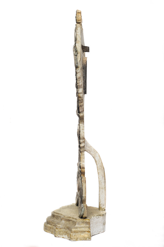 Reliquiario in argento finemente sbalzato a mano a motivi di foglie d'acanto e riccioli. Base e struttura in legno. Fine XVII sec.