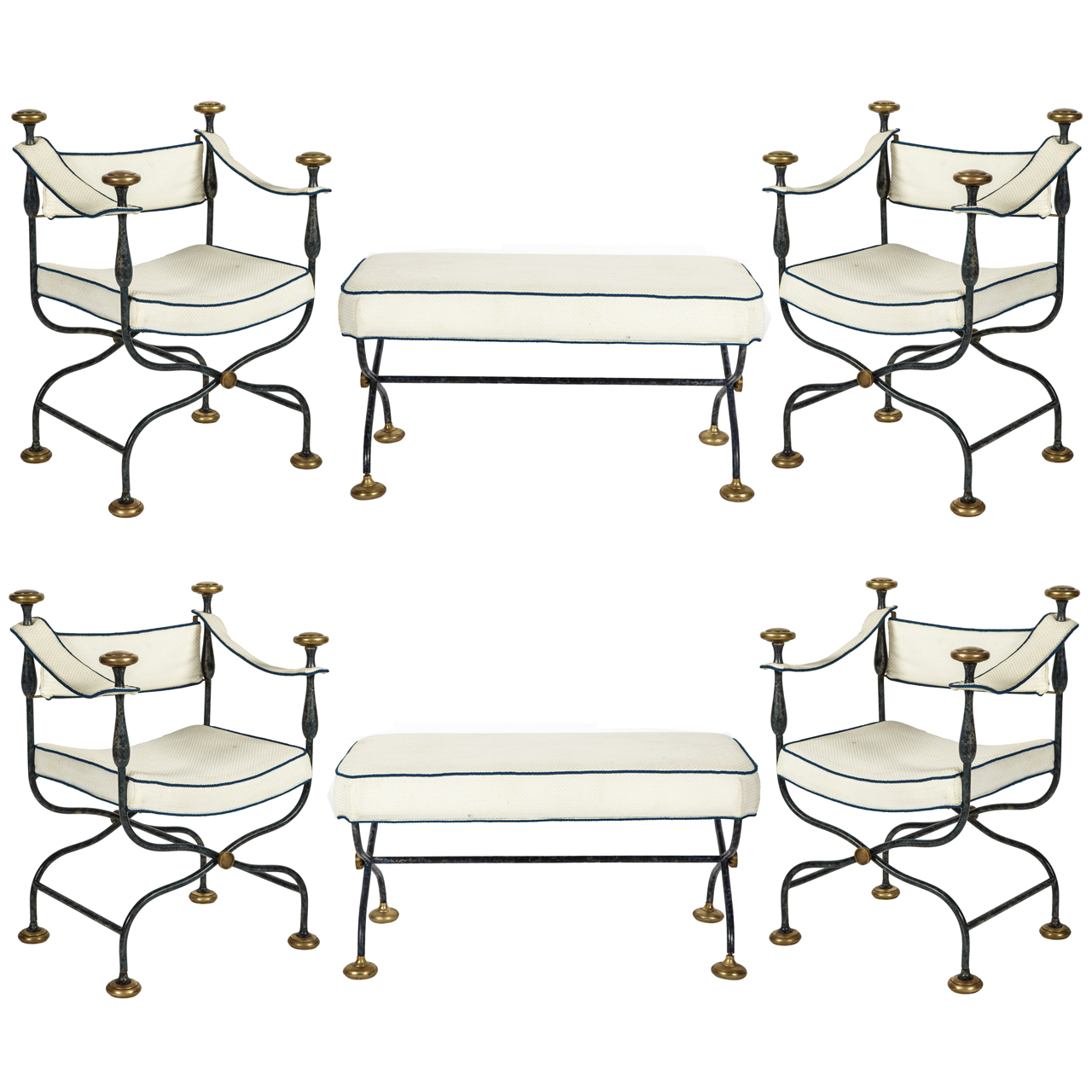 Circa 1880, set di quattro poltroncine e due panche Faldistori, in ferro battuto e laccato finto marmo blu, con pomoli e medaglioni in ottone originali.