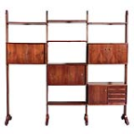 Mobile libreria da parete di Albini. Struttura in legno con tre montanti verticali e tre elementi contenitori, di cui uno a ribalta, uno con cassetti ed il terzo a due ante. 1957.